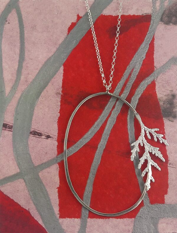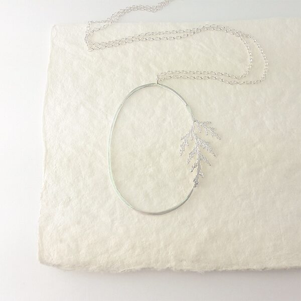 El colgante esencia es una fusión entre lo moderno y lo orgánico. Contrastan la geometría del óvalo y la armonía de lo natural.